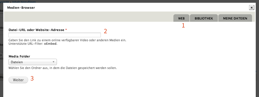 Im Unterschied dazu werden natürlich keine Dateien hochgeladen, sondern es genügt, den Link zum Video anzugeben. Wählen Sie dazu den Reiter aus (1) und geben sie den Link ins Eingabefeld ein (2). Klicken Sie dann auf Weiter (3) und im sich daraufhin öffnenden Datei-Formular unten auf Speichern.
