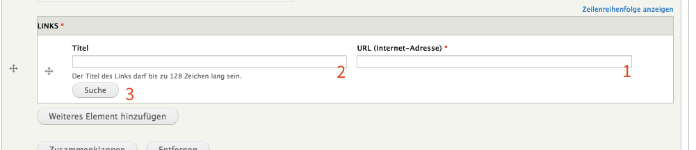 Spezielle Link-Felder (zum Beispiel im Datei-Formular oder beim Inhaltstyp: Links) enthalten für jeden Link ein Eingabefeld für die Web-Adresse (1) und eines für den Titel (2), also den Text, den der Besucher als Link angezeigt bekommt. Auch hier können Sie die Link-Suchmaschine (analog zum Text-Editor) nutzen. Klicken Sie dazu auf den Button Suche (3).