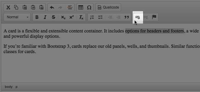 Im Text-Editor können Sie Textstellen mit anderen Seiten verlinken, in dem Sie den betreffenden Text auswählen und dann das Link-Symbol in der Symbolleiste klicken. Es öffnet sich ein Fenster, in dem Sie entweder nach Inhalten auf der Website suchen können (1) oder direkt die Adresse einer externen Website eingeben (2).